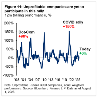 This combination of revised growth expectations and stronger realised earnings helps explain why markets are higher without signalling complacency. Furthermore, gains remain concentrated in profitable, large-cap firms with durable secular drivers, notably in technology and financials. While more cyclically exposed businesses have faced larger downward earnings revisions and unprofitable companies have failed to participate in the rally (Chart 1 – below). Options markets also continue to price above-average volatility, another indication that investors are not complacent.