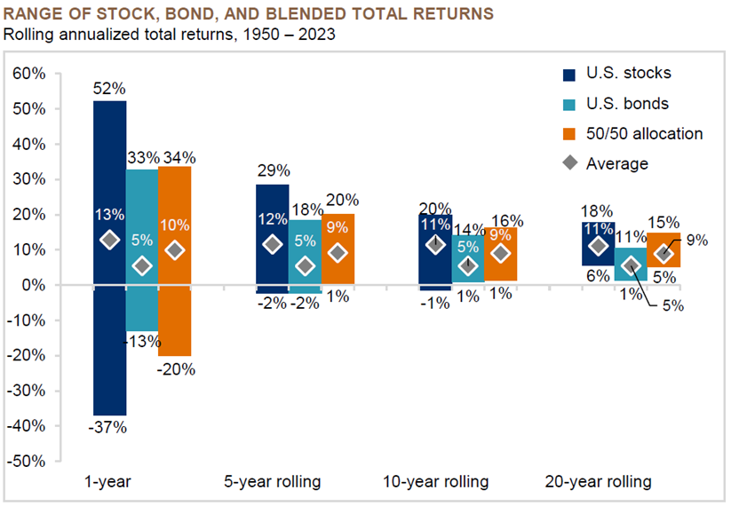 Volatility is an inherent part of investing. However, history has shown that markets trend upward over the long term. A chart by JP Morgan (June 2024), which tracks the best and worst 1-, 5-, 10-, and 20-year rolling periods from 1950 to the end of 2023, illustrates that there hasn’t been a single negative period for global stocks, bonds, or a 50/50 portfolio during these timeframes.