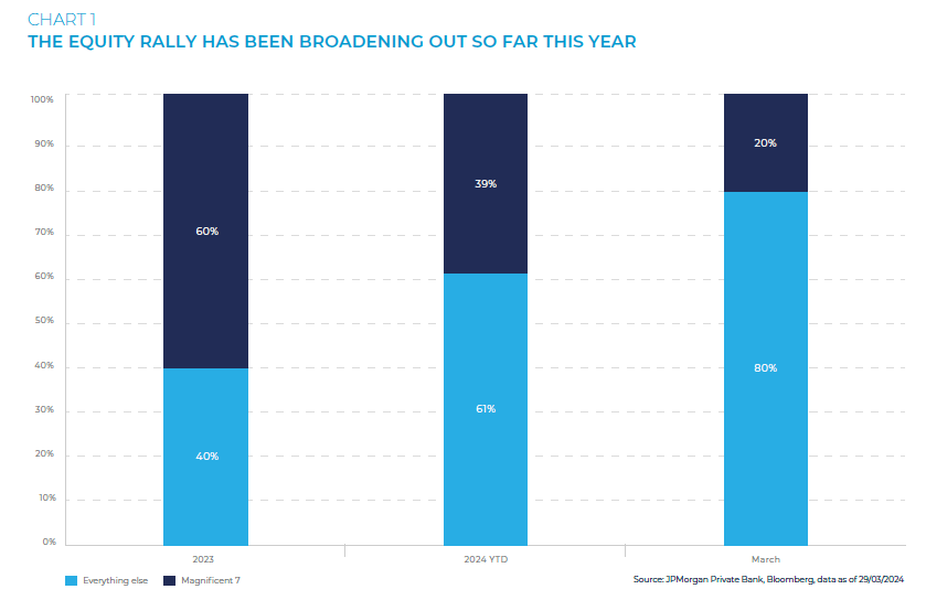 US and European equity indices climbed to new all-time highs as markets were buoyed by robust corporate earnings. Following a year of very narrow market breadth with the Magnificent 7 driving the majority of returns in 2023, we saw a wider contribution in the first quarter of 2024 as illustrated in Chart 1. US equity markets marginally outperformed their European counterparts but for the first time in over a year we saw the S&P 500 outperform the NASDAQ 100 over the quarter. Notably, the S&P 500 equal weighted index also outperformed the market cap weighted index by 1.15% in March, in a sign of widening breadth.