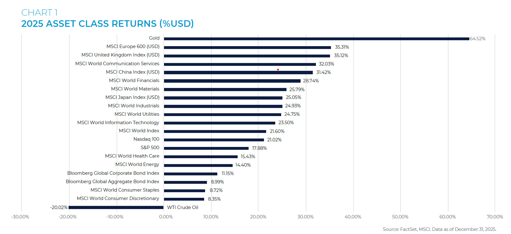 By year end, the MSCI World Index (USD) was up 21.6%, with global risk assets performing well overall as highlighted in Chart 1. Most major equity markets also posted strong gains in local currency terms, but for USD-based investors the currency backdrop added to their returns picture. With the US Dollar Index down ~10.2% year-to-date, foreign equity gains translated into more dollars when converted back, boosting the USD total return on international indices. However, it is worth emphasising that while FX can meaningfully influence returns over shorter horizons, over longer investment periods these effects tend to mean-revert, leaving underlying corporate fundamentals as the main drivers of returns.