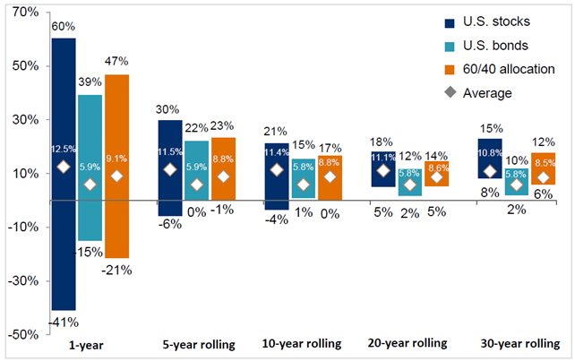 Sources: Barclays, FactSet, Federal Reserve, Robert Shiller, Strategas/Ibbotson, J.P. Morgan Asset Management. Returns shown are rolling monthly returns from 1950 to June 30, 2024. Stocks represent the S&P 500 Shiller Composite, and Bonds represent Strategas/Ibbotson government bonds for periods from 1950 to 2017, then Bloomberg Finance L.P. Barclays U.S. Treasury Total Return index from 2017 to 2024. 60/40 portfolio is rebalanced monthly and assumes no cost. Data as of January 2, 2025.